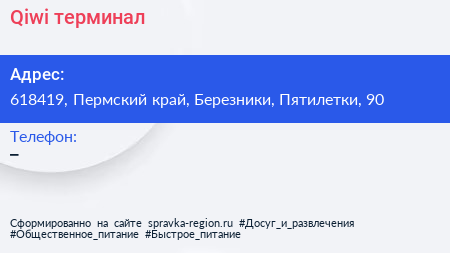 Qiwi, терминал по адресу 618419, Пермский край, Березники, Пятилетки, 90 в дальнейшем Организация, размещена в следующих категориях:
