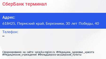 СберБанк, терминал по адресу 618425, Пермский край, Березники, 30 лет Победы, 40 в дальнейшем Организация, размещена в следующих категориях: