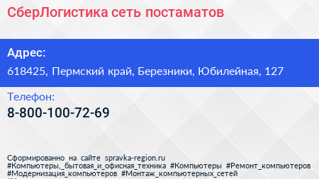 СберЛогистика, сеть постаматов по адресу 618425, Пермский край, Березники, Юбилейная, 127 в дальнейшем Организация, размещена в следующих категориях: