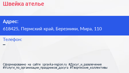 Швейка, ателье по адресу 618425, Пермский край, Березники, Мира, 110 в дальнейшем Организация, размещена в следующих категориях: