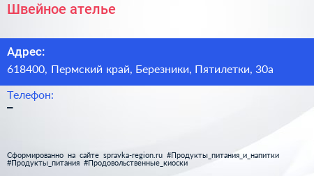 Швейное ателье по адресу 618400, Пермский край, Березники, Пятилетки, 30а в дальнейшем Организация, размещена в следующих категориях: