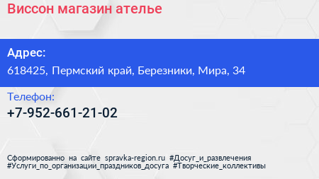 Виссон, магазин-ателье по адресу 618425, Пермский край, Березники, Мира, 34 в дальнейшем Организация, размещена в следующих категориях: