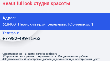 Beautiful look, студия красоты по адресу 618400, Пермский край, Березники, Юбилейная, 1 в дальнейшем Организация, размещена в следующих категориях: