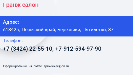 Гранж, салон по адресу 618425, Пермский край, Березники, Пятилетки, 87 в дальнейшем Организация, размещена в следующих категориях: