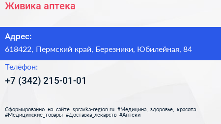 Живика, аптека по адресу 618422, Пермский край, Березники, Юбилейная, 84 в дальнейшем Организация, размещена в следующих категориях: