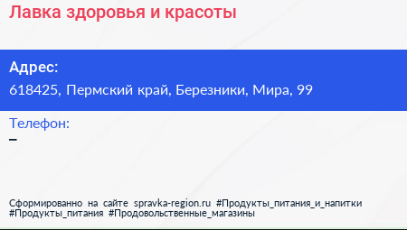 Лавка здоровья и красоты по адресу 618425, Пермский край, Березники, Мира, 99 в дальнейшем Организация, размещена в следующих категориях: