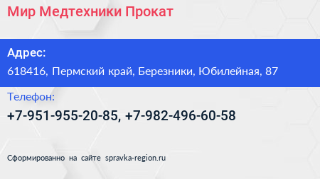 Мир Медтехники+Прокат по адресу 618416, Пермский край, Березники, Юбилейная, 87 в дальнейшем Организация, размещена в следующих категориях: