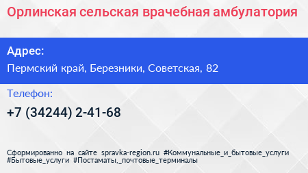 Орлинская сельская врачебная амбулатория по адресу Пермский край, Березники, Советская, 82 в дальнейшем Организация, размещена в следующих категориях:
