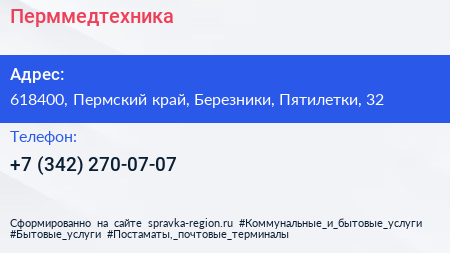 Перммедтехника по адресу 618400, Пермский край, Березники, Пятилетки, 32 в дальнейшем Организация, размещена в следующих категориях: