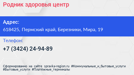 Родник здоровья, центр по адресу 618425, Пермский край, Березники, Мира, 19 в дальнейшем Организация, размещена в следующих категориях: