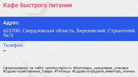 Кафе быстрого питания по адресу 623700, Свердловская область, Березовский, Строителей, 9а/3 в дальнейшем Организация, размещена в следующих категориях: