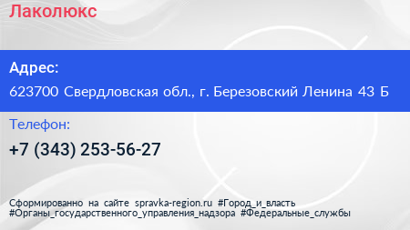 Лаколюкс по адресу 623700 Свердловская обл., г. Березовский Ленина 43 Б в дальнейшем Организация, размещена в следующих категориях: