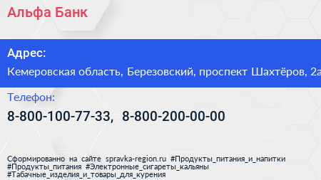 Альфа-Банк по адресу Кемеровская область, Березовский, проспект Шахтёров, 2а в дальнейшем Организация, размещена в следующих категориях: