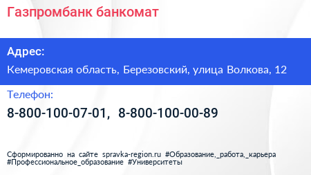 Газпромбанк, банкомат по адресу Кемеровская область, Березовский, улица Волкова, 12 в дальнейшем Организация, размещена в следующих категориях: