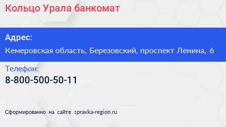 Кольцо Урала, банкомат по адресу Кемеровская область, Березовский, проспект Ленина, 6 в дальнейшем Организация, размещена в следующих категориях: