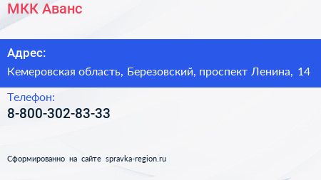 МКК Аванс по адресу Кемеровская область, Березовский, проспект Ленина, 14 в дальнейшем Организация, размещена в следующих категориях: