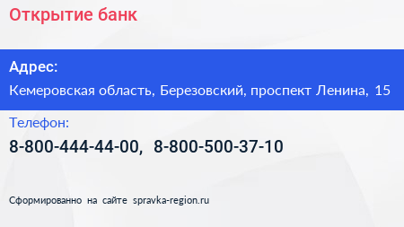 Открытие, банк по адресу Кемеровская область, Березовский, проспект Ленина, 15 в дальнейшем Организация, размещена в следующих категориях: