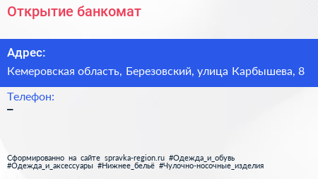 Открытие, банкомат по адресу Кемеровская область, Березовский, улица Карбышева, 8 в дальнейшем Организация, размещена в следующих категориях: