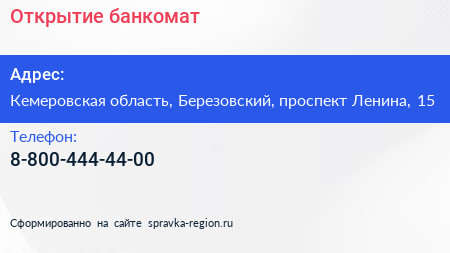 Открытие, банкомат по адресу Кемеровская область, Березовский, проспект Ленина, 15 в дальнейшем Организация, размещена в следующих категориях: