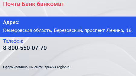 Почта Банк, банкомат по адресу Кемеровская область, Березовский, проспект Ленина, 18 в дальнейшем Организация, размещена в следующих категориях: