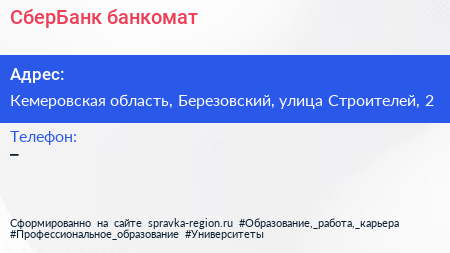 СберБанк, банкомат по адресу Кемеровская область, Березовский, улица Строителей, 2 в дальнейшем Организация, размещена в следующих категориях: