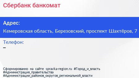 Сбербанк, банкомат по адресу Кемеровская область, Березовский, проспект Шахтёров, 7 в дальнейшем Организация, размещена в следующих категориях: