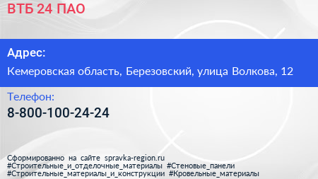 ВТБ 24, ПАО по адресу Кемеровская область, Березовский, улица Волкова, 12 в дальнейшем Организация, размещена в следующих категориях: