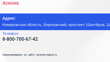 Аскона по адресу Кемеровская область, Березовский, проспект Шахтёров, 2а в дальнейшем Организация, размещена в следующих категориях: