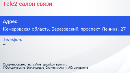 Tele2, салон связи по адресу Кемеровская область, Березовский, проспект Ленина, 27 в дальнейшем Организация, размещена в следующих категориях: