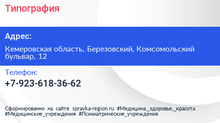 Типография по адресу Кемеровская область, Березовский, Комсомольский бульвар, 12 в дальнейшем Организация, размещена в следующих категориях: