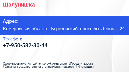 Шалунишка по адресу Кемеровская область, Березовский, проспект Ленина, 24 в дальнейшем Организация, размещена в следующих категориях: