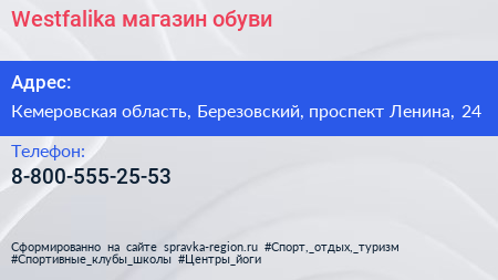 Westfalika, магазин обуви по адресу Кемеровская область, Березовский, проспект Ленина, 24 в дальнейшем Организация, размещена в следующих категориях: