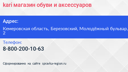 kari, магазин обуви и аксессуаров по адресу Кемеровская область, Березовский, Молодёжный бульвар, 2 в дальнейшем Организация, размещена в следующих категориях: