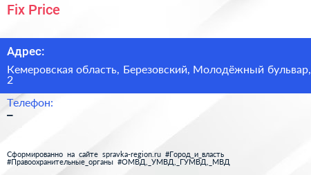 Fix Price по адресу Кемеровская область, Березовский, Молодёжный бульвар, 2 в дальнейшем Организация, размещена в следующих категориях: