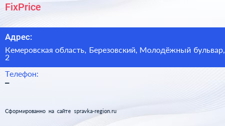 FixPrice по адресу Кемеровская область, Березовский, Молодёжный бульвар, 2 в дальнейшем Организация, размещена в следующих категориях:
