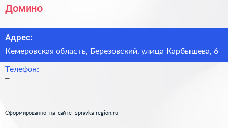 Домино по адресу Кемеровская область, Березовский, улица Карбышева, 6 в дальнейшем Организация, размещена в следующих категориях: