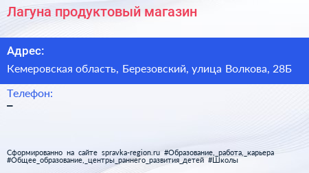 Лагуна, продуктовый магазин по адресу Кемеровская область, Березовский, улица Волкова, 28Б в дальнейшем Организация, размещена в следующих категориях: