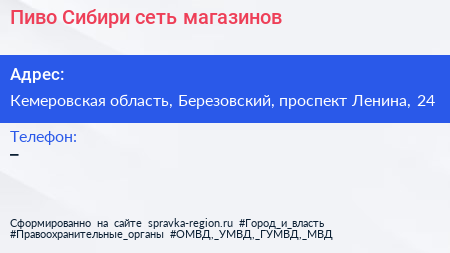 Пиво Сибири, сеть магазинов по адресу Кемеровская область, Березовский, проспект Ленина, 24 в дальнейшем Организация, размещена в следующих категориях: