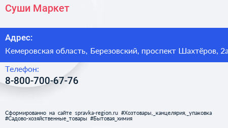 Суши-Маркет по адресу Кемеровская область, Березовский, проспект Шахтёров, 2а в дальнейшем Организация, размещена в следующих категориях: