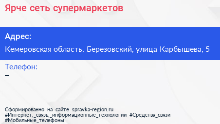 Ярче!, сеть супермаркетов по адресу Кемеровская область, Березовский, улица Карбышева, 5 в дальнейшем Организация, размещена в следующих категориях: