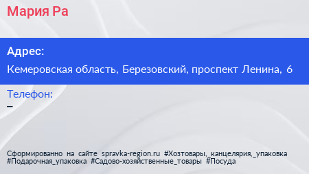 Мария-Ра по адресу Кемеровская область, Березовский, проспект Ленина, 6 в дальнейшем Организация, размещена в следующих категориях: