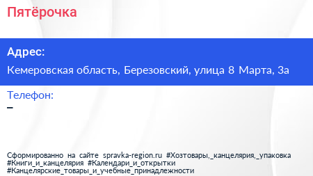 Пятёрочка по адресу Кемеровская область, Березовский, улица 8 Марта, 3а в дальнейшем Организация, размещена в следующих категориях: