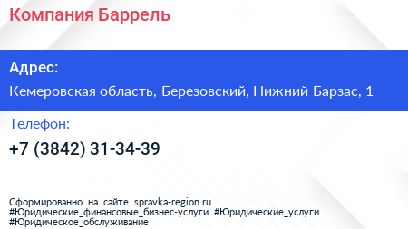 Компания Баррель по адресу Кемеровская область, Березовский, Нижний Барзас, 1 в дальнейшем Организация, размещена в следующих категориях: