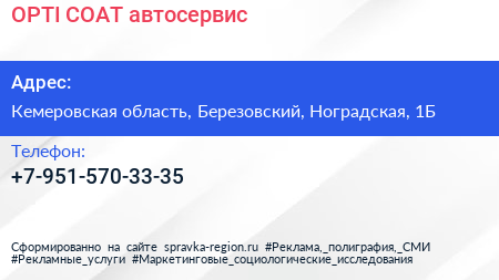 OPTI-COAT, автосервис по адресу Кемеровская область, Березовский, Ноградская, 1Б в дальнейшем Организация, размещена в следующих категориях: