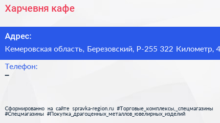 Харчевня, кафе по адресу Кемеровская область, Березовский, Р-255 322 Километр, 4 в дальнейшем Организация, размещена в следующих категориях: