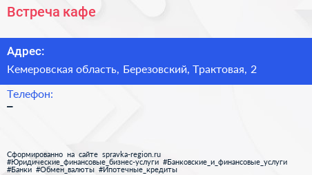 Встреча, кафе по адресу Кемеровская область, Березовский, Трактовая, 2 в дальнейшем Организация, размещена в следующих категориях: