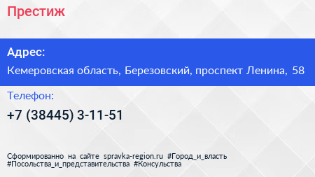 Престиж по адресу Кемеровская область, Березовский, проспект Ленина, 58 в дальнейшем Организация, размещена в следующих категориях: