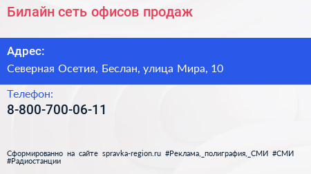 Билайн, сеть офисов продаж по адресу Северная Осетия, Беслан, улица Мира, 10 в дальнейшем Организация, размещена в следующих категориях: