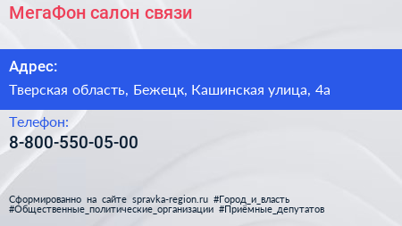 МегаФон, салон связи по адресу Тверская область, Бежецк, Кашинская улица, 4а в дальнейшем Организация, размещена в следующих категориях: