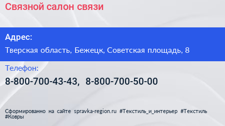 Связной, салон связи по адресу Тверская область, Бежецк, Советская площадь, 8 в дальнейшем Организация, размещена в следующих категориях: